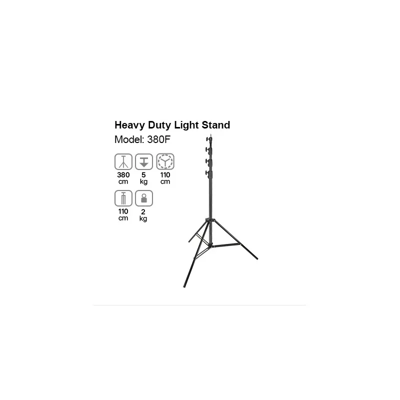 Godox 380F lieljaudas gaismas statīvu var izmantot, lai atbalstītu zibspuldzi studijas vai vietas fotografēšanas laikā. Gaismas statīvs ir ļoti izturīgs un viegli lietojams. Šis gaismas statīvs ar regulējamu augstumu no 110 līdz 380 cm piedāvā pareizo darba augstumu gandrīz ikvienam.