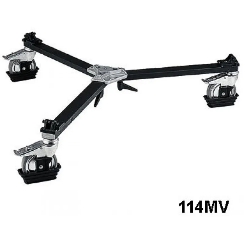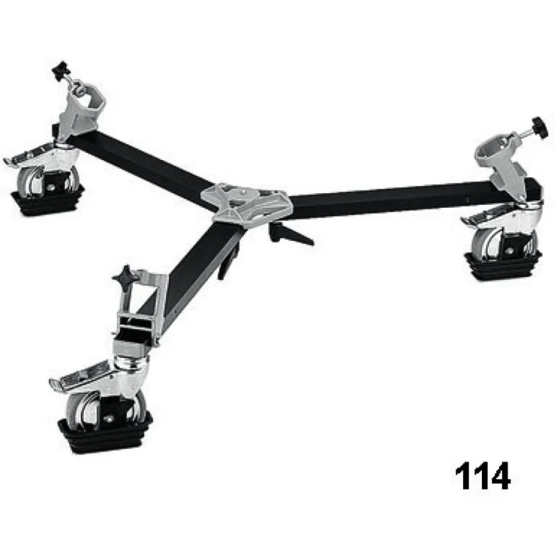 The Manfrotto 114 is the Cine/Video Dolly. This dolly is designed for use with the Universal and Heavy-Duty tripods. Individually braked 5" wheels and a unique leg locking system make it extremely stable. Easy to assemble and disassemble for transporting.