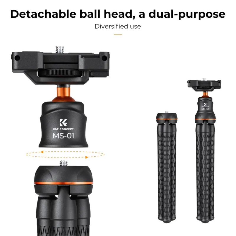 This versatile 2-in-1 tripod and phone clip system is your ideal companion for capturing moments on the go. It seamlessly accommodates both mobile phones and cameras, offering you the flexibility to document lifes adventures wherever you are. The package includes a handy Bluetooth remote control that pairs effortlessly, enabling you to take photos or record videos within a 10-meter range for up to 10 hours continuously. With a robust load capacity of 3kg, it caters to most mirrorless cameras, mobile devices, and other equipment while remaining lightweight at only 0.32kg, making it perfect for travel and outdoor shooting. Its flexible legs can be contorted and secured to various surfaces, from lamp posts and railings to tree branches and chairs, ensuring you can easily capture clear and creative shots. Crafted from durable, bend-resistant materials, it features a non-slip silicone pad for stability. Waterproof and corrosion-resistant, its ready for action, even by the sea. The 360-degree horizontal and 90-degree vertical rotation of the spherical head provides complete shooting coverage, allowing you to effortlessly capture the perfect angle and field of view for landscapes, portraits, and sports scenes alike.