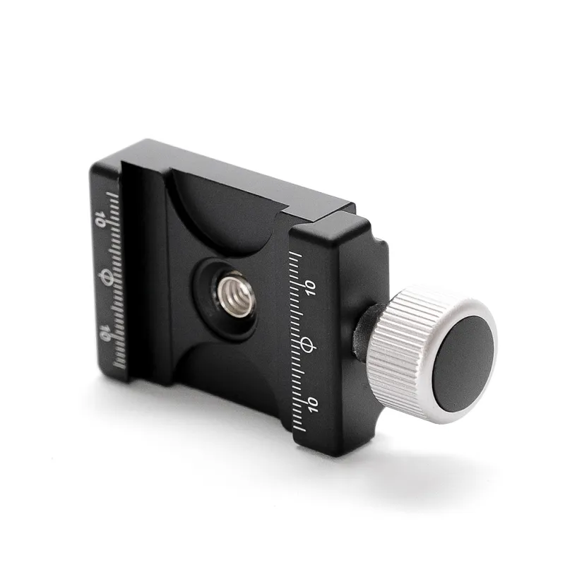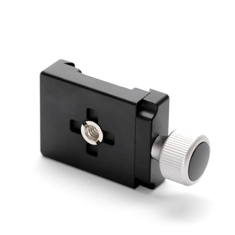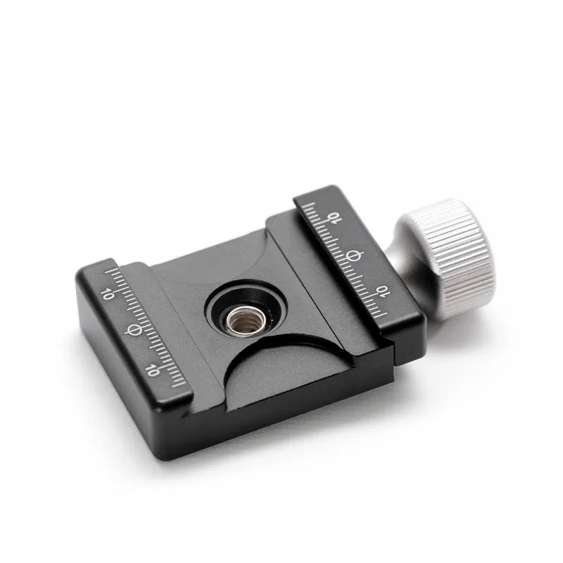 The Caruba Quick Release - DC-38 is a clamp with screw-type rotary knob suitable for mounting on a tripod, monopod or ball head that has a 3/8" thread. A traditional screw-type clamp has a higher clamping force than lever-release clamps. This clamp features a recessed central socket on top and a 3/8"-16 thread. This clamp allows for quick mounting or changing of a camera with tripod plate, lens plate or L-plate.