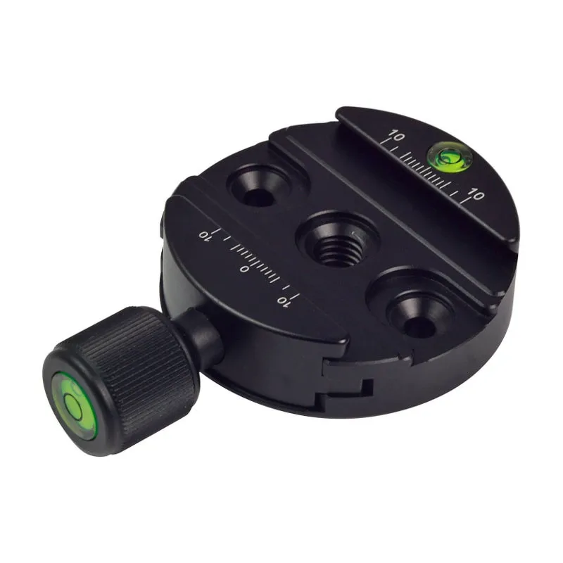 The Caruba Quick Release - DM-60 is suitable for mounting on tripod, monopod or ball head with 3/8" thread. Thanks to the sturdy dial, the DM-60 allows you to easily and quickly mount Arca-Swiss compatible tripod plates. The clamp is equipped with an integrated spirit level. The mounting plate is equipped with a recessed central socket on the top. The clamp has a diameter of 6 centimetres and a height of 1.7 centimetres.