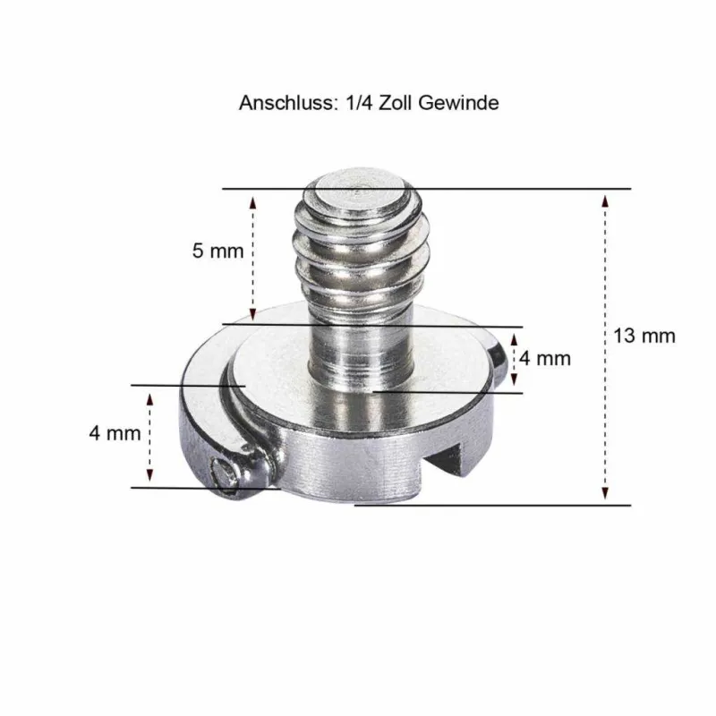Ar šo 1/4 collas kameras stiprinājuma skrūvi varat piestiprināt savu foto aprīkojumu, piemēram, kameras vai videokameras, pie ātri noņemamām plāksnēm. Skrūve tiek vienkārši ieskrūvēta no apakšas ātrās atbrīvošanas plāksnē un pēc tam pieskrūvēta jūsu ierīces 1/4 collas vītnei. 4 mm garš laukums bez vītnes nodrošina iespēju brīvi pārvietot aprīkojumu ātrās atbrīvošanas plāksnē. Šī stiprinājuma skrūve ar 1/4 collas vītni ir izgatavota no augstas stiprības nerūsējošā tērauda un ir ļoti precīza.