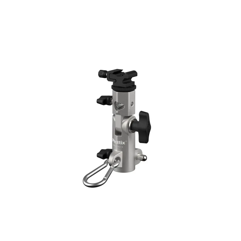 Varos Pro S daudzfunkcionālais zibspuldzes statīva lietussarga turētājs no Phottix ir par 300% izturīgāks nekā iepriekšējās versijas, un tam ir alumīnija sakausējuma korpuss ar metāla auksto statīvu, kā arī 3/8" un 1/4" ieliktnis ar iekšējo vītni un 3/8" un 1/4" skrūves. Turētāja lāsītes formas lietussarga stiprinājums ir piemērots 7 līdz 10 mm diametra vārpstām, un tas ir 8 grādu slīps, lai vairāk gaismas nonāktu lietussarga centrā. Patentētais 180 grādu slīpēšanas mehānisms iztur līdz 55 mārciņām (25 kg). Varos Pro S ir caurums ar klipsi piekāršanai, lai to varētu izmantot kopā ar pretsvaru vai citu piederumu.