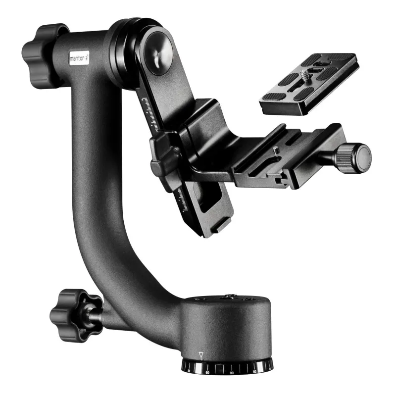 The professional Gimbal tripod head is ideal for the use of long, heavy lenses in sports or nature photography. It was developed to facilitate the vertical or horizontal tracking of quickly moving objects and to prevent the camera or lens from sinking like it can happen with ball heads. Therefore the gravity center of the equipment is optimally balanced.