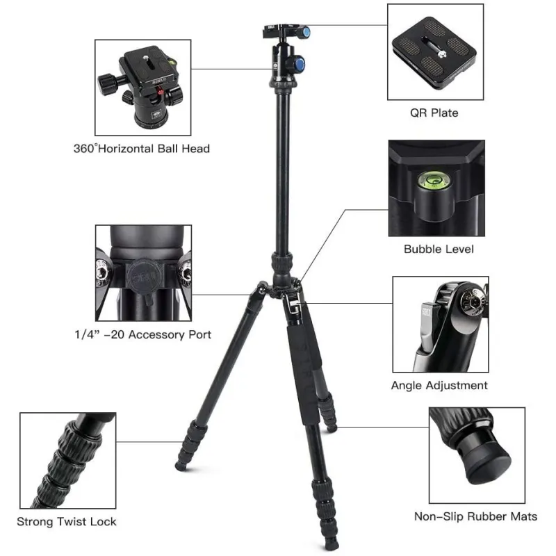 - Saderīgs ar Arca-swiss: ātri atvienojama plāksne ar standarta 1/4" skrūvi ātrai kameras savienošanai, saderīga ar lielāko daļu digitālo kameru.