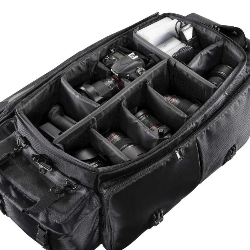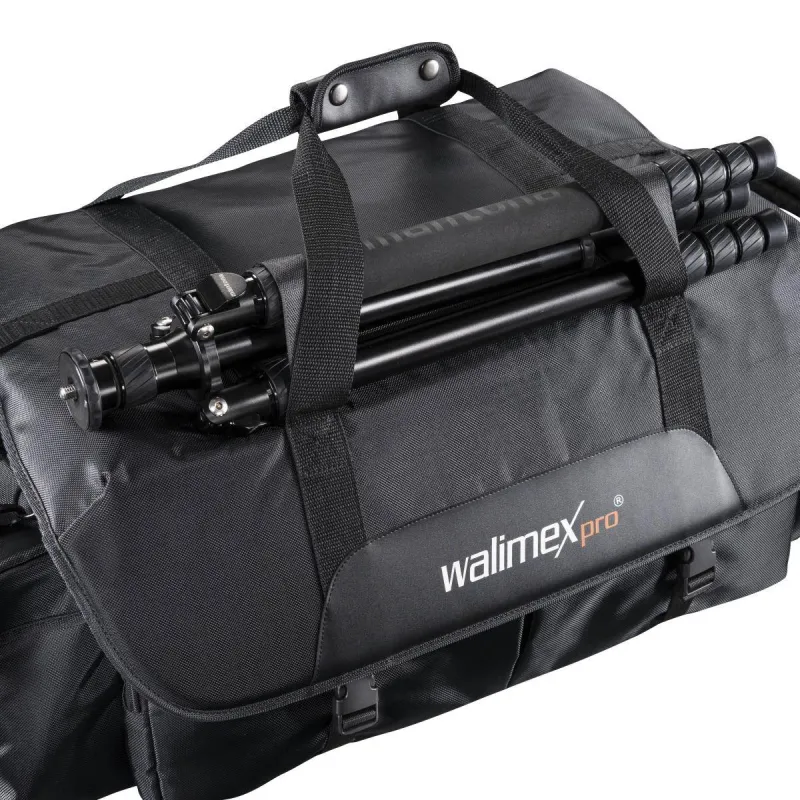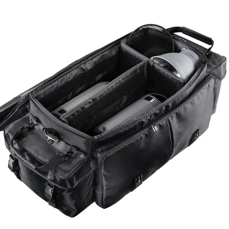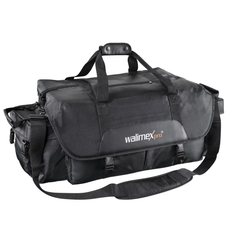 The qualitative high-grade walimex pro Photo and Studio Bag XXL is a low priced solution for transporting your photo/studio equipment. The bag is approx.75x34x30cm (LxHxW) large and equipped with variable, padded interior dividers. Therefore, it is suitable for transporting two studio flashguns or also for the accommodation of your other camera equipment. Various extra compartments offer sufficient space for small parts and accessories.