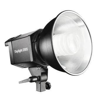 Walimex Daylight 250s Due to the use of the Aurora/Bowens bayonet our Daylight 250s is compatible with many light controls from our product range. The sturdy metal reflector enables precision light guidance and offers additional protection. The recess on the reflector enables the installation of a transillumination or reflex umbrella directly on the lamp, the light is therefore bundled almost centrally by the umbrella. Due to the vast variety of usable light controls, our robust daylight lamp is perfectly suitable for both portrait and product photography. Moreover, the illuminant only generates little heat, which prevents the unpleasant development of heat, even in continuous operation.