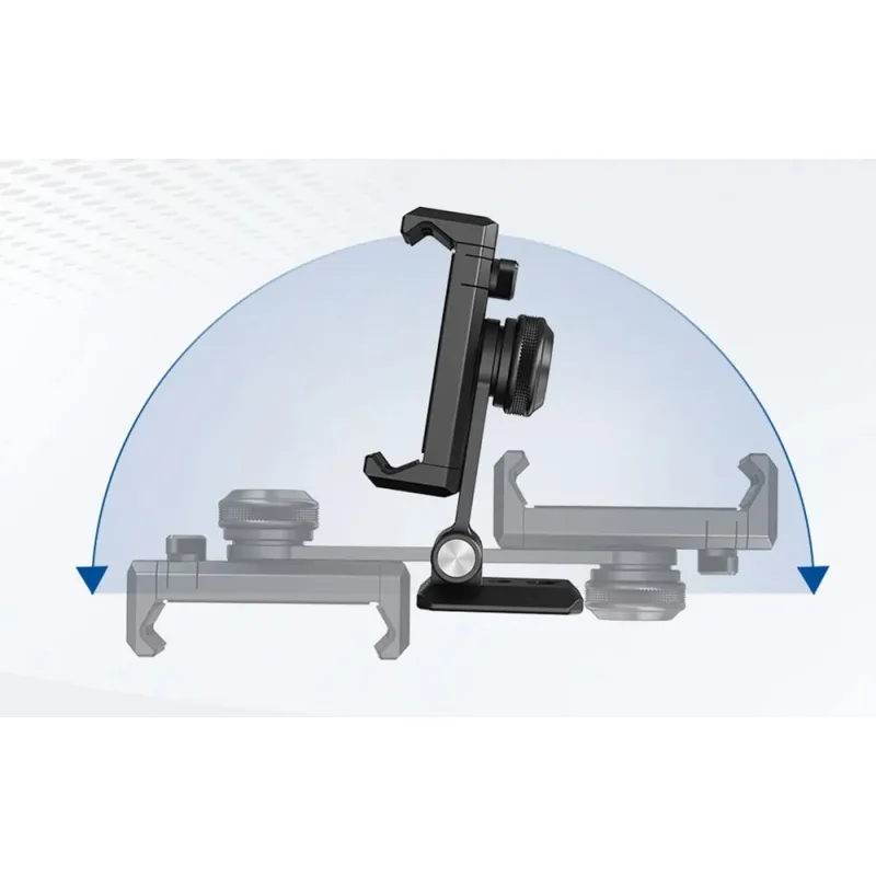 Arca tipa pamatne ļauj nekavējoties piestiprināt adapteri pie statīva galvām, kas saderīgas ar Arca Swiss sistēmu. Ja izmantojat citus piederumus, divas vītnes - 1/4" un 3/8" - sniedz elastību statīva vai rokas izvēlē. Turklāt galva ļauj 270 grādu rotāciju un 180 grādu slīpumu, ļaujot bez piepūles pāriet no horizontāliem uz vertikāliem kadriem, nesatraucot telefonu.