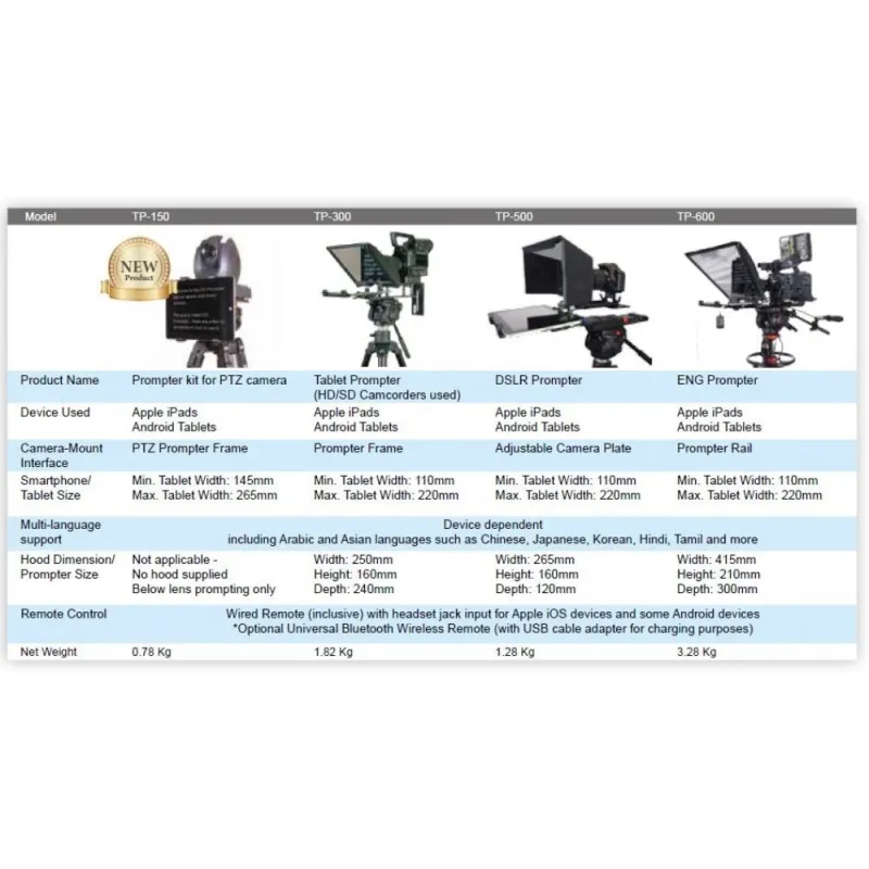 Piemērots planšetdatoriem līdz 11,6". TP-300 ir izstrādāts, lai pārvērstu nelielu planšetdatoru par lētu un ļoti efektīvu teleprompteri.
