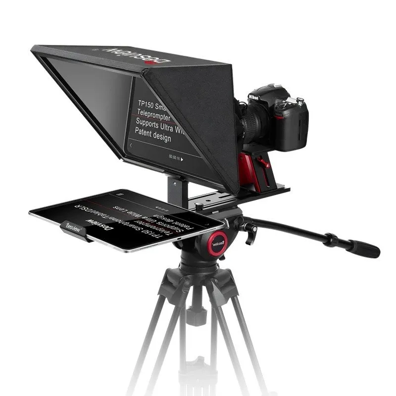 The Desview TP150 is a professional teleprompter designed to work with cameras, DSLRs and mirrorless cameras. Thanks to the use of a universal hood, you can precisely adapt it to the size of your lens. The unit features a large mirror made of 26-layer glass to separate the light beam. The adjustable mount allows you to connect the teleprompter to a tablet up to 15.3″.