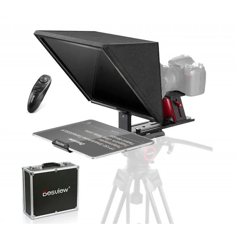 The Desview TP150 is a professional teleprompter designed to work with cameras, DSLRs and mirrorless cameras. Thanks to the use of a universal hood, you can precisely adapt it to the size of your lens. The unit features a large mirror made of 26-layer glass to separate the light beam. The adjustable mount allows you to connect the teleprompter to a tablet up to 15.3". The Bluetooth remote control will allow you to remotely control the text, which you can manage from the free app. The teleprompter is made of high-grade aluminium alloy. You can easily install it on a tripod using 1/4" or 3/8" threads. A sturdy carrying case is also included. The device will save you hundreds of hours spent endlessly repeating shots! Main product features professional teleprompter at an excellent price ability to read text from tablets up to 15.3" invaluable support when recording vlogs, interviews or streams enables you to read text while looking straight into the lens of a camera or camcorder allows you to record video quickly and efficiently, without having to learn the text by heart supports the recording of live TV programmes, webinars and video courses a great choice for musicians who publish their performances online and have trouble remembering lyrics clear and sharp HD image transferred from tablet screen to mirror 26-layer beam splitting glass (70/30) no shadows or vignetting effect even on very wide shots innovative design to maintain the same lens-to-mirror distance when changing the camera position in the up/down plane adjustable camera position up/down (45mm) and front/rear (190mm) convenient installation of teleprompter on tripods (1/4" and 3/8" threads) free app (iOS / Android) for saving displayed scenarios and notes remote control (scroll / rewind / speed up / slow down / stop) of the displayed text using the included Bluetooth remote control possibility to install the tablet vertically and horizontally possibility to record vertically using the L-bracket (to be purchased separately) made from high quality aluminium alloy professional transport case lockable with robust latches foam filling in the case for adequate protection of the individual elements of the kit No need to learn the text by heart! Do you know that feeling when you've recorded the same part of a speech on camera for the hundredth time because some part of the script keeps falling out of your head? Or maybe the viewers have pointed out to you that you often run off with your eyes in the direction of the people accompanying you on set? The teleprompter will make speaking to the camera or camera much easier. With the Desview TP150, you will save valuable time and record your vlogs or webinars looking straight into the lens without stammering. Patented design The Desview TP150 teleprompter was developed for professionals and amateurs working with small and medium-sized cameras, as well as anyone shooting video with DSLR and mirrorless cameras. The patented mount allows you to maintain the same distance between the lens and the mirror, no matter how high your device is (45mm adjustable). This solution will allow you to quickly set up your workstation, no matter what equipment you are shooting with. Image sharpness The Desview TP150 teleprompter uses 26-layer beam splitting glass (70/30), with a high level of hardness and damage resistance. It provides excellent transmittance that ensures a sharp, high-quality image. Thanks to these parameters, there is no double reflection effect and the text read from the teleprompter is clear and looks almost the same as on a tablet screen. Vertical and horizontal The extendable arm allows you to connect the teleprompter to tablets up to 15.3". The large mirror will ensure adequate visibility of the displayed text. The span of the tablet holder can range from 10 to 29.5 mm. This allows you to install the source screen both vertically and horizontally. Wide viewing angle When working with the Desview TP150 teleprompter, you don't have to worry about vignetting effects, even when reaching for wide-angle lenses. When recording, you won't be surprised by any shadows or unwanted objects entering the frame. You won't see your camera connected to a mirror and tablet in any shot. If you are not betrayed by a robotic tone of voice, no one will surely realise you are using a teleprompter! Free mobile app In the Google Play (Android) and App Store (iOS) shops, you will find a free mobile app to manage your display. It will allow you to control parameters such as scrolling speed, background colour or letter size. The app allows you to save many different documents. This will allow you to plan several episodes of your programme and record them in one sequence, without having to swap scripts. When working with the app, a thin horizontal line will also be displayed on the screen. It will make reading from the teleprompter look natural and your eyes will always be directed to the central part of the lens. Remote control You will also find a remote control included with the device. Simply pair it via Bluetooth with the app and stop the text, slow it down or speed it up at any time. The ergonomic shape makes the remote control fit perfectly in your hand, and the most necessary buttons and joystick position themselves under the right fingers! The ability to manage text discreetly, without having to approach the camera, will further improve your video work. Safe transport The teleprompter mirror is such a delicate device that transport in a backpack with other film accessories is inadvisable, due to the risk of scratches. This is why the manufacturer has made sure to provide a professional case with an aluminium frame and foam filling. It will provide the ultimate in storage comfort for your equipment. Each of the kit's components has its own perfectly adapted compartment here. This ensures that your Desview TP150 teleprompter will always be safe during transport. Specification model: Desview TP150 material of c