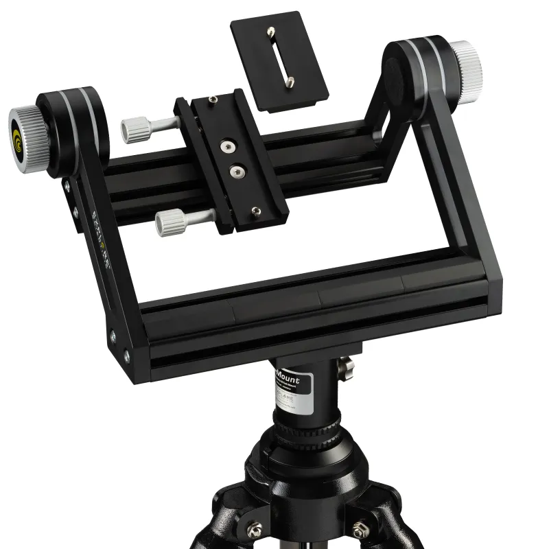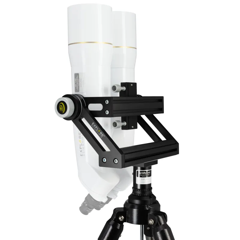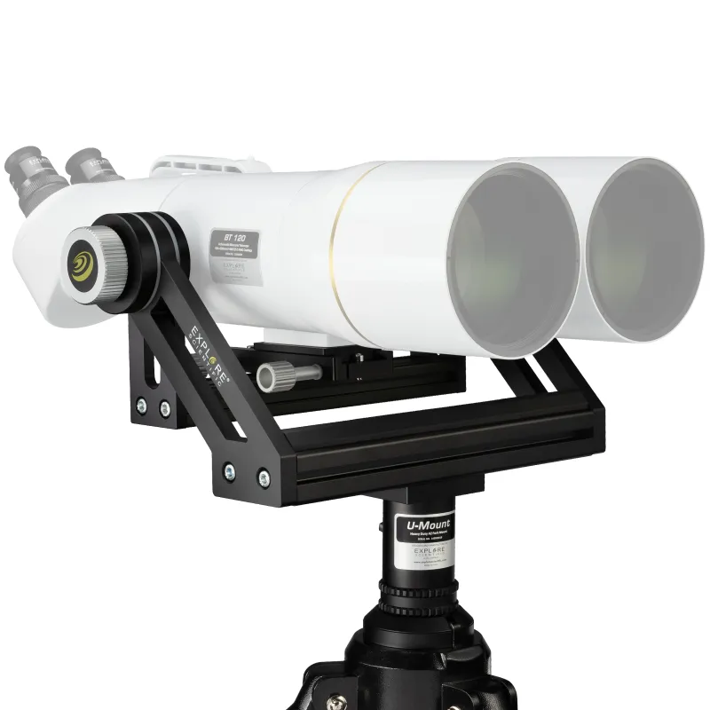 Massive fork mount with excellent and adjustable mechanics for large binoculars with tripod When using giant binoculars, a stable mount and tripod with an appropriate load capacity is absolutely necessary. The new EXPLORE SCIENTIFIC U-mount with field tripod has been specially designed for the EXPLORE SCIENTIFIC BT series of giant binoculars, but also fits most other binoculars from 70 to 120mm lens diameter, which have a 1/4 inch photo thread connection on the underside. With the U-mount there is no shaking or annoying vibrations, the combination is as solid as a piece of iron and provides unlimited observation pleasure in all binocular adjustment positions. Whether you are observing the starry sky or the landscape, the U-mount is a solid base for your giant binocular and allows soft and smooth movements in both axes. The U-mount as a base for giant binoculars and always with you on every excursion An easily transportable but solid mount is essential when using giant binoculars. A simple photo tripod with ball head or video tilt head is quickly overloaded here. The new EXPLORE SCIENTIFIC U-mount has an excellent mechanism with adjustable friction in both axes, and allows easy adjustment and tracking even when the load is fully utilised. Depending on the adjusted intensity of the friction, the binocular position is kept stable or a soft and smooth movement can be achieved. The large adjustment screws on both axes are smooth and easy to operate even with gloves and clammy fingers. Vibrations are reduced to an absolute minimum by the solid construction of the U-mount. Even at high magnification, there are no shakes and the finest details can be observed. The U-mount and tripod can be separated for easy transport. Mounting the large binoculars on the U-mount The binoculars can be mounted and removed in a few seconds using the quick-release adapter plate included in the scope of delivery. This is a major advantage, especially for mobile outdoor use. The connection between binoculars and adapter plate is made by two 1/4 inch threaded bolts (standard photo tripod thread), which are variably guided in a slotted hole. A universal use with different binoculars is thus possible. The double screw connection guarantees a very secure fit of the binoculars. The adapter plate itself is also attached to the U-mount with the help of two large clamping screws, which are easy to use even when wearing gloves. Nothing wobbles here and all controls are easy to use.
