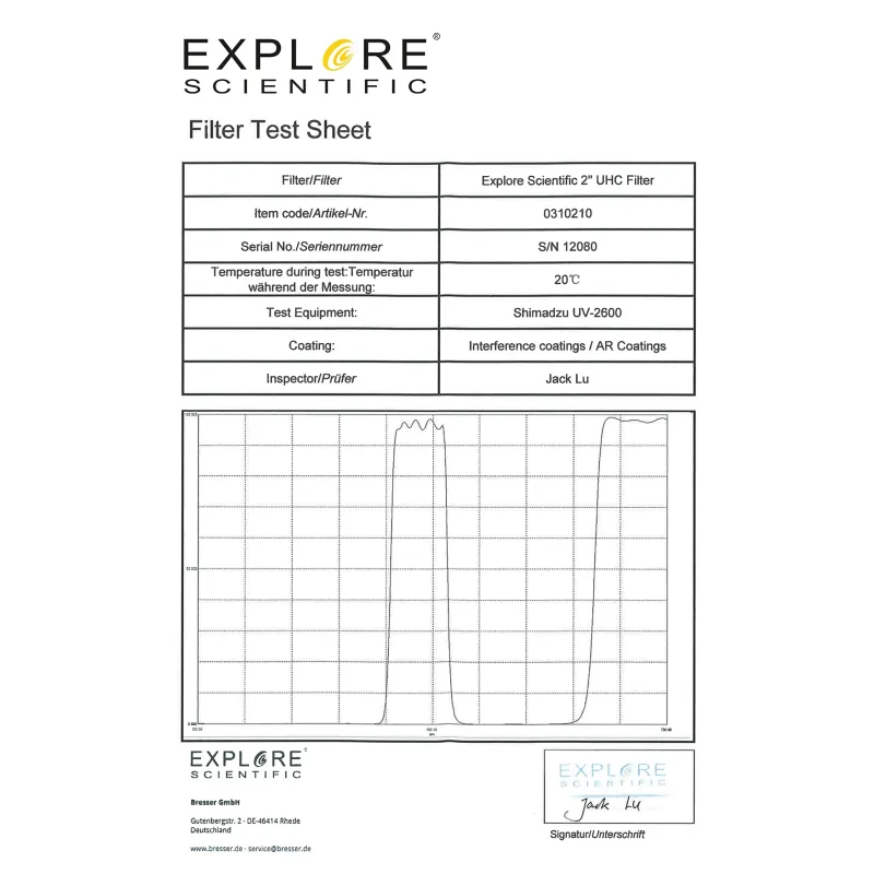 Viens no svarīgākajiem šķēršļiem nakts debess izpētē ir nakts debess izgaismošana ar mākslīgo apgaismojumu, piemēram, ielu gaismām. Nakts debesis nav īsti tumšas pilsētu tuvumā, kas ārkārtīgi samazina ārpus Saules sistēmas esošo objektu redzamību. Atkarībā no debess objekta veida ir iespējams krasi palielināt kontrastu, bloķējot traucējošu mākslīgo apgaismojumu. EXPLORE SCIENTIFIC UHC filtrs "no nulles" uz tā saukto emisijas miglāju viļņu garumiem. Šie objekti spīd īpašās krāsās - to emisijas līnijās. Šīs emisijas līnijas ir saistītas ar ķīmiskajiem elementiem - šajā gadījumā ar ūdeņradi 486 nm un 656 nm, kā arī skābekli 496 nm un 501 nm. EXPLORE SCIENTIFIC UHC miglāju filtrs bloķē visus pārējos krāsu viļņu garumus (un līdz ar to gandrīz visu mākslīgo gaismu), un filtru var izlaist tikai ūdeņraža un skābekļa emisijas līnijas. Rezultāts ir pārsteidzošs: pēkšņi ir redzamas miglājiņas vietās, kas bez filtra bija pilnīgi neredzamas. Piepilsētas debesīs, piemēram, pūču miglāja M97, Vēdera miglāja NGC 6992 vai pat spožā Dumbella miglāja M27 nav skaidri redzamas. Izmantojot šo filtru, var daudz sīkāk saskatīt miglājus un to struktūras. Nepieciešams ikvienam vizuālajam vērotājam. Explore Scientific miglāju filtriem ir pievienots individuālas pārbaudes sertifikāts - jūsu garantija, ka saņemat augstākās kvalitātes filtru.