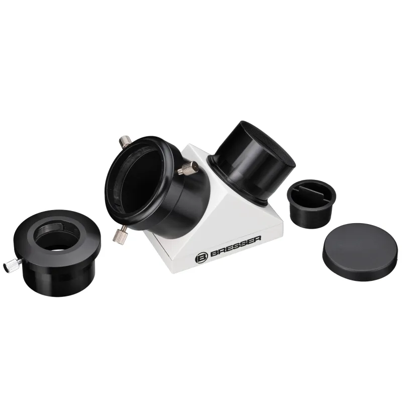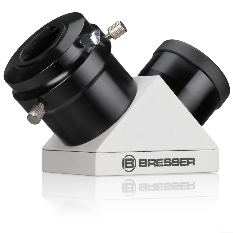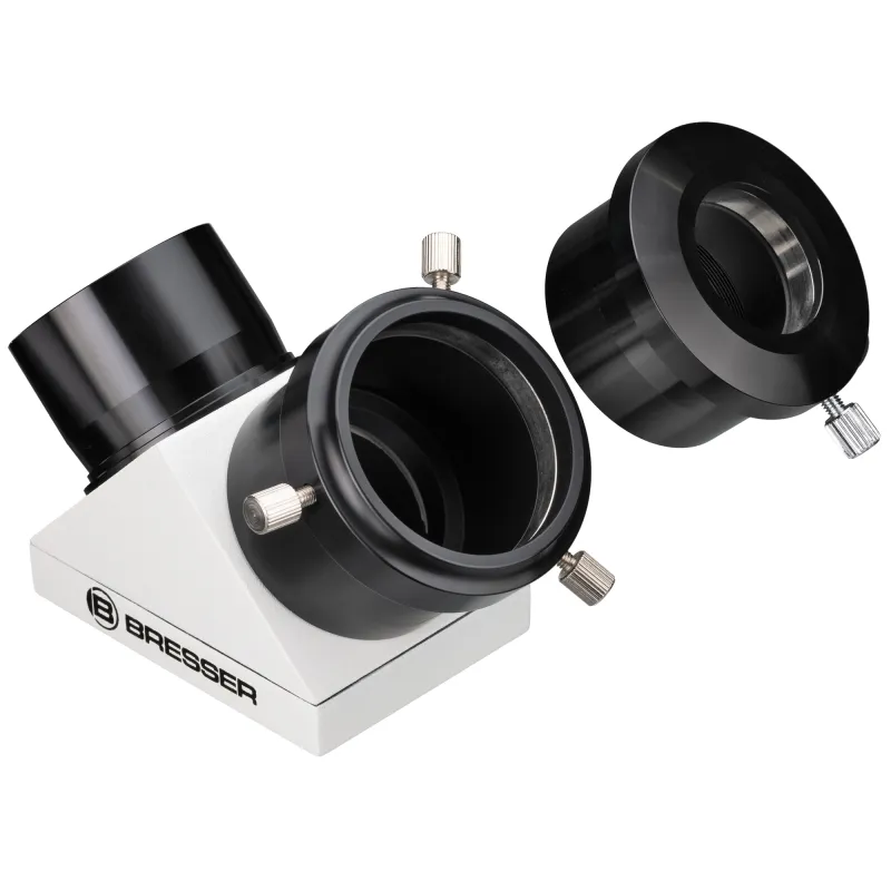 A very good diagonal mirror for telescopes with 2" focuser and for the BRESSER Messier telescopes with a 2.5"- HEX focuser . Enables the use of eyepieces and accessories with 2" barrel, so that a wider field of view can be reached. A larger light beam and a comfortable observation position is achieved by this 2 inch zenith mirror. Especially for use with refractors and for zenith observations a useful accessory. The clamping ring is made of brass, so there will be no scratch marks on your high-quality eyepiece. The precise clamping is another advantage. The BRESSER 2" Diagonal Mirror is completely made of metal and has a very accurate flat mirror. The dielectrical coating delivers a 93% reflectance and is very durable against enviromental influences .