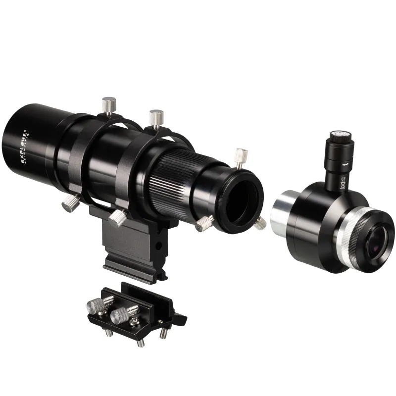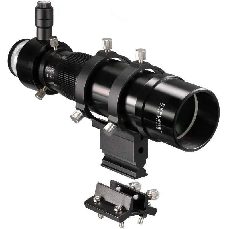 Use as mini travel telescope This viewfinder and guide telescope can also be used quite simply as a mini travel telescope. With the optional eyepieces, a magnification of 8x to 40x can be achieved. Nearly all eyepieces with a focal length of 5 to 26mm and 1.25 inch/31.7mm plug connection are suitable. Especially recommended are the EXPLORE SCIENTIFIC eyepieces of the 52 degree (Art. 02195xx) and 62 degree (02196xx) LER series. Note: Only straight view use is possible. Metal viewfinder holder and viewfinder shoe The mount of this viewfinder and guide telescope is completely made of aluminium and is a stable base. The viewfinder mount is suitable for many common types of telescopes, such as EXPLORE SCIENTIFIC, BRESSER MESSIER etc. If the existing viewfinder shoe is not compatible, a matching viewfinder shoe is also included. This can be attached to the telescopic tube by means of four M5 screws. The bore distances of the viewfinder shoe are 31.7mm on the longitudinal and transverse axis. The six large adjustment screws with non-slip knurling make it easy to align the viewfinder, even with clammy fingers. All adjusting and clamping screws have plastic tips that effectively prevent the viewfinder housing and viewfinder mount from being scratched.