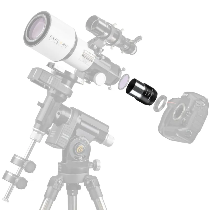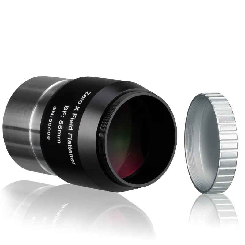 Field flattener without reduction factor for Explore Scientific ED80 and ED102 APO Refractors The imaging plane of many telescopes is not flat but curved. This means that only the area in the centre is perfectly focused - the edge becomes blurred. The human eye can usually compensate for this image property, but a camera shows increasing blurriness towards the edge of the image field. The Explore Scientific Zero X field flattener eliminates the field curvature in many telescopes with a focal length of approx. 480 to 720 mm. The Zero X field flattener was calculated and developed for Explore Scientific ED80 and ED102 apochromats with focal ratios of F=6.0 and F=7.0. The image sharpness at the edge is dramatically increased. The stars appear round and no longer distorted - a clear benefit for the whole image aesthetics. The Zero X image flattener can be used not only with Explore Scientific Apos, but also with many other Apos. This flattener does not change the focal length of the telescope.