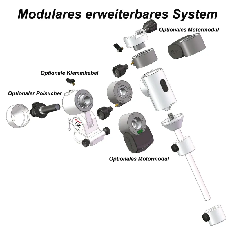 Deklinācijas korpusa bloks ļauj paplašināt AP Photoguider līdz pilnīgam ekvatoriālajam AP uzstādījumam ar mototizētām RA un DC asīm. Jūs varat pārvietot un izsekot montāžu abās asīs. Turklāt jums būs nepieciešams manuālās precīzās regulēšanas modulis vai DEC motora modulis, kā arī AP pretsvara stienis un pretsvars. Visus SX sērijas stiprinājumu pretsvarus var izmantot uz pretsvara stieņa. Šim blokam var pievienot arī APZ pretsvaru. Iebūvētais akumulatora nodalījums kalpo kā papildu barošanas avots, un to darbina 4 AA baterijas.