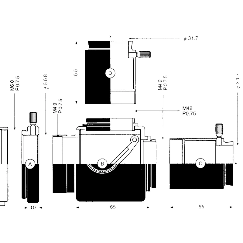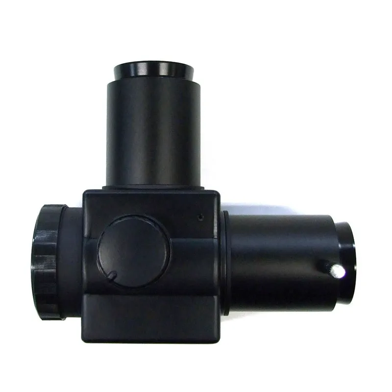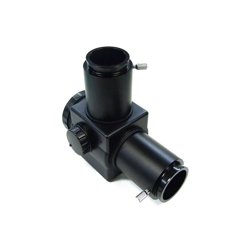 The Vixen flip mirror is an ingenious solution for viewing in a straight line or at a 90-degree angle . The viewing angle can be changed by turning a wheel . The main connection features a 50.8 mm barrel, which is then reduced to one of the two 31.7 mm receptacles. There is also a T2 thread for a DSLR camera when the 31.7 mm eyepiece is removed. This allows you to connect your camera directly to the telescope with an optional T2 ring .