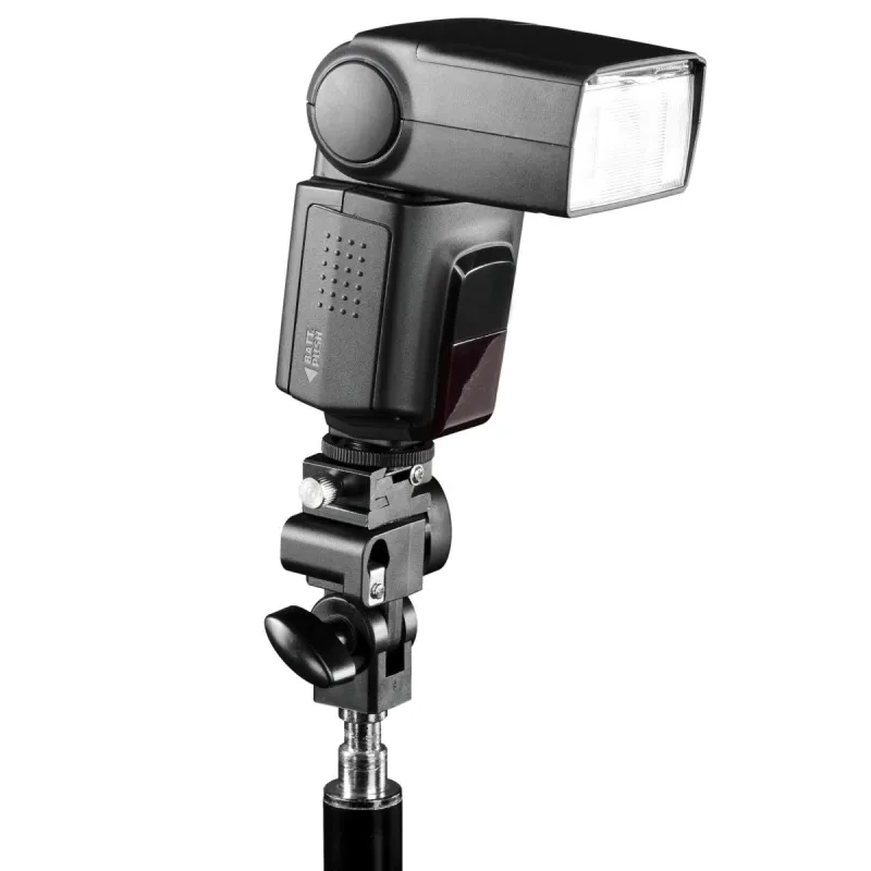 The system flash bracket by walimex is a precisely crafted helper for a photographer’s daily work. The bracket can be tilted by 90 degrees and locked into position in both directions with the help of an engagement mechanism. That way the connection between tripod and flash shoe is fixed and the tilt is easily reproducible. An accidental readjusting, e.g. due to weight, can be avoided that way. Additionally, the flash shoe can be rotated by 360 degrees and locked into position with a screw. Due to the 1/4 and 3/8 inch mount on the bottom of the flash bracket, you can mount it to most camera and lamp tripods and the purchase of specialized tripods is not necessary.
