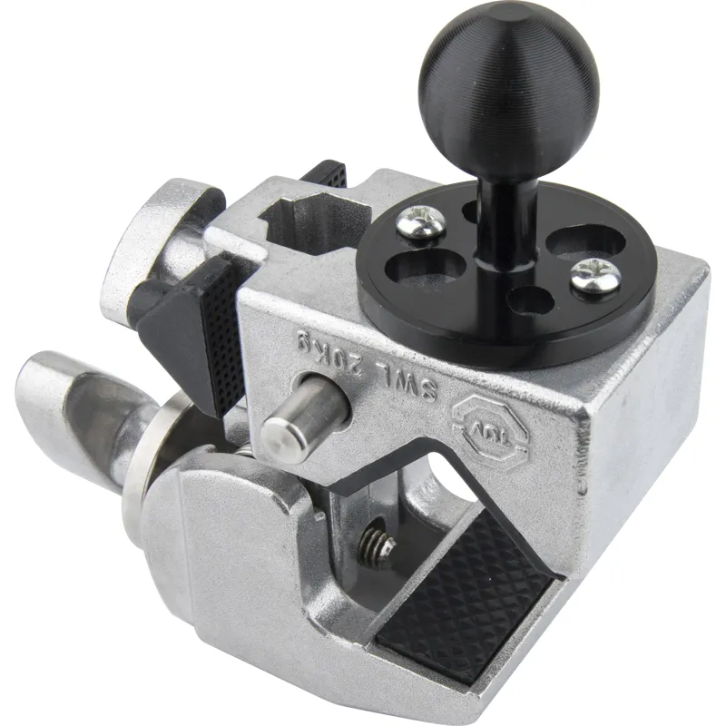 Alumīnija bumbu galva ir aprīkota ar caurumiem apaļajā plāksnē, kas paredzēta montāžai uz Super Convi skava ar M5 skrūvēm (iekļautas) vai standarta sieru plāksnēm ar diviem 3/8 skrūvēm un uzgriežņiem vai diviem 1/4-20 skrūvēm un uzgriežņiem (iekļautas) uz 1 centra-uz-centra caurumu vieglai savienošanai ar super knuckle sistēmu.