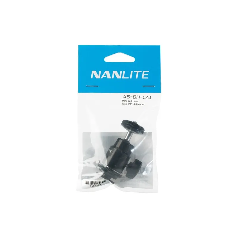The Nanlite Mini Ball Head with Hot Shoe Adapter securely slides into your camera's hot shoe and also offers a female 1/4"-20 receiver for stand mounting. At the top is a single action locking ball head with a 1/4"-20 male thread that is compatible with a variety of accessories.
