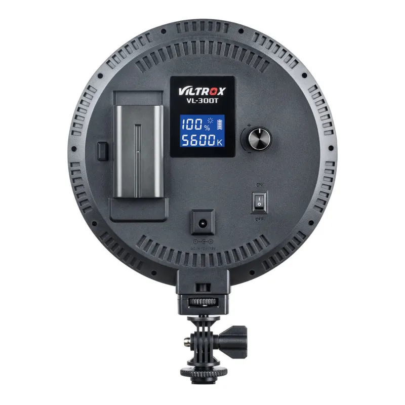 The VL-300B features a built-in L-series battery plate and can also be powered by a separately available AC adapter. The light can last for about 1.2 hours on full brightness when using an NP-750 battery. On the back, the bright easy-to-read LCD screen displays the status of your battery, brightness percentage, and color temperature. Included with the light is an adjustable shoe adapter that allows you to mount the light on a camera shoe mount, and it features a 1/4"-20 mounting thread on the bottom.