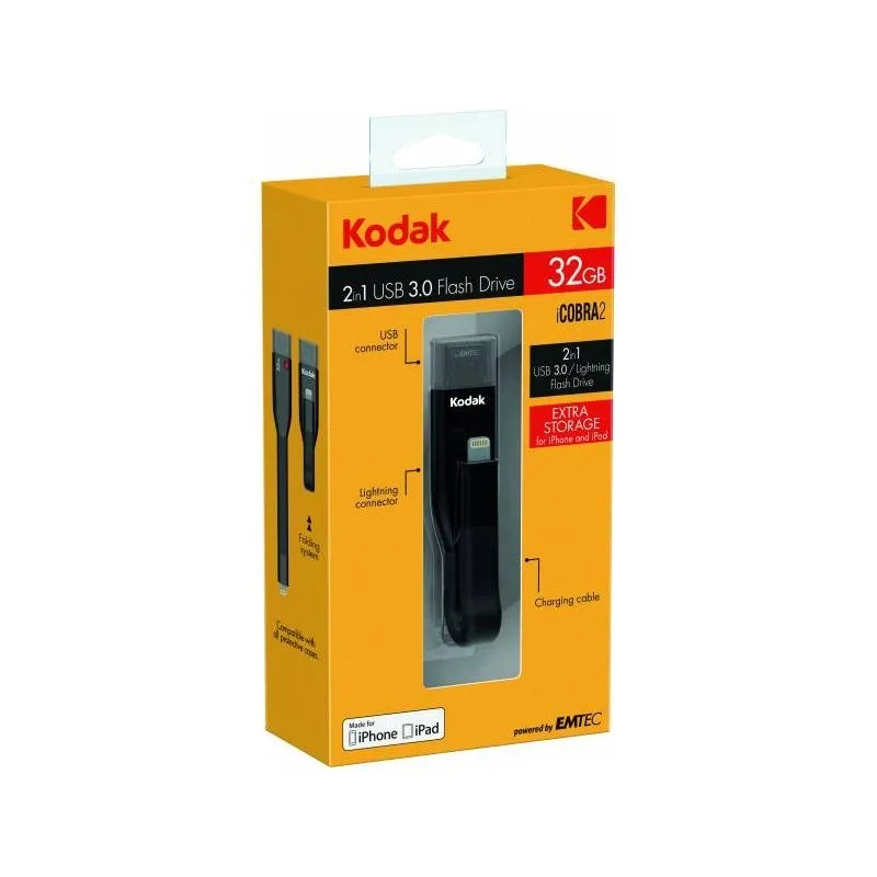 Kodak iCobra2 device connecting memory stick with cable Lightning connector, for charging and data transfer. It is also equipped with USB 3.0, which provides ten times faster transfers than USB 2.0. The Kodak iCobra2: - Free up space in the memory of your iPhone or iPad. - Quickly recharge devices with Lightning connector. - easily move files from your iPhone or iPad on Mac or PC. - will create instant data backup in the cloud (using the dedicated application). - Save your photos and videos directly iCobra2 on.