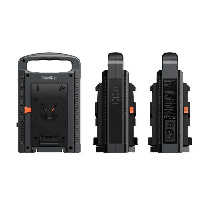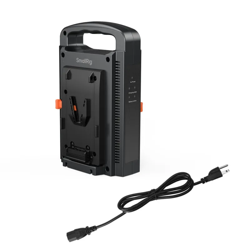 Lādētājs atbalsta SmallRig V montāžas akumulatorus un lielāko daļu V montāžas akumulatoru tirgū. Sānos atrodami vairāki darbības indikatoru gaismas, piemēram, jaudas, uzlādes statusa un akumulatora uzstādīšanas indikatori, lai jūs varētu reāllaikā uzraudzīt akumulatora uzlādes progresu. Šim lādētājam ir inovatīvs krāsu saskaņojuma izskats, un virsmas materiāls ir krāsots ar izsmidzināšanu, kas ievērojami uzlabo spīdumu un tekstūru. Lādētājam ir ērta rokturis augšpusē vieglai pārvietošanai, savukārt saliekamais atbalsts apakšā nodrošina stabilu un ērtu darbību, padarot to par ideālu lādētāju V montāžas akumulatoriem.