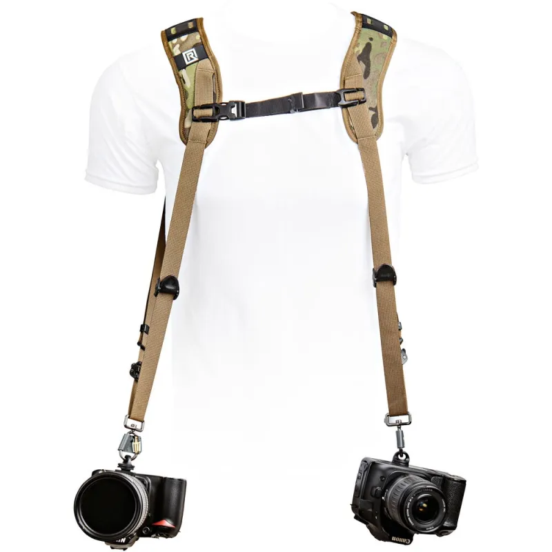 BlackRapid dubultās kameras siksna Ar šo BlackRapid dubultās kameras siksnu jūs varat vienlaikus nēsāt divas kameras - vienu no kreisās un otru no labās puses. Pat tad, ja jums ir divas smagas kameras ar piestiprinātiem objektīviem, siksnas valkāšanas ērtums saglabājas ļoti augsts. To nodrošina elastīgie un elpojošie spilventiņi, kas aizsargā jūsu plecus un muguru. Polsterējumu elpojošās īpašības novērš svīšanu siltos apstākļos.