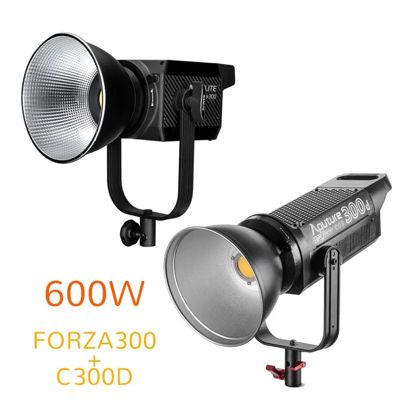 Komplektā ietilpst Forza300 600W LED un Aputure C300D LED gaismas, statīvi, gaismas veidotāji pēc izvēles no pieejamā klāsta.