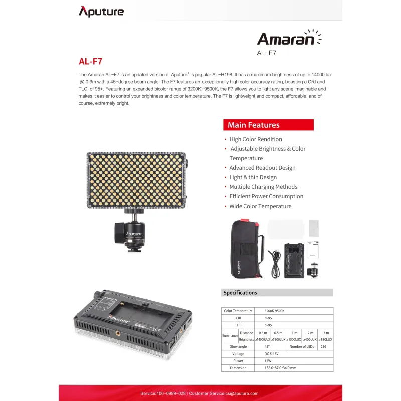 F7 vienā mazā panelī ir iesaiņotas 256 augstas CRI LED gaismas, kas nodrošina spēcīgu jaudu līdz 14000 luksiem 0,3 m. Sekojot Amaran saimes ciltsrakstam, F7 ir mantojis pamatpārliecību, ka augstas jaudas, krāsu precīzam apgaismojumam vienmēr jābūt par pieņemamu cenu.