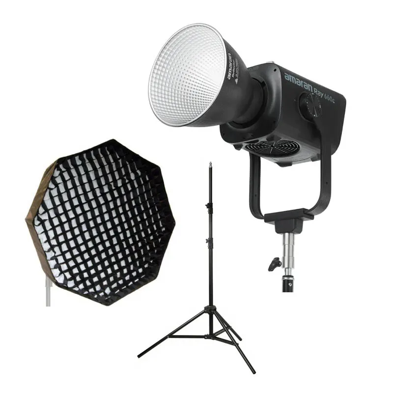 Komplektā ietilpst Amaran Ray 660c gaisma, gaismu statīvs, reflektors, softbokss pēc izvēles (kas ir pieejami).