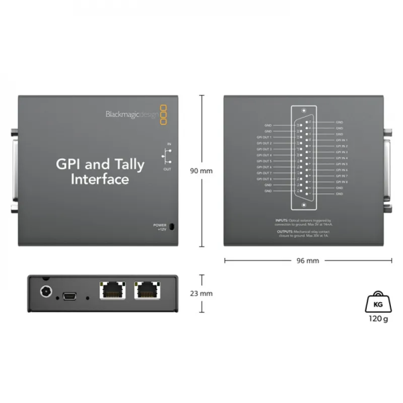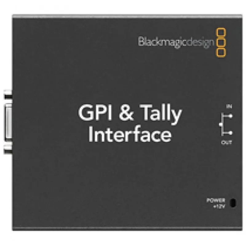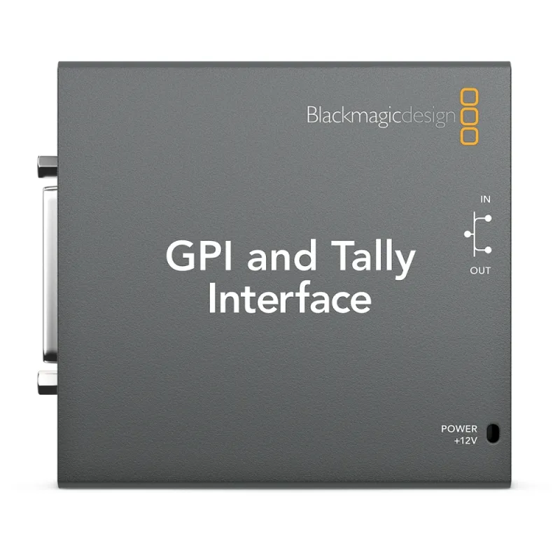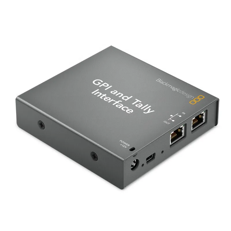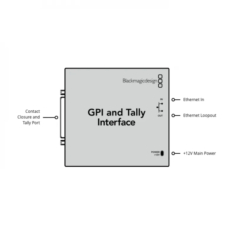 The GPI and Tally Interface by Blackmagic Design is an Ethernet device which provides eight mechanical relay contacts closures to ground that can be used for tally. Tally signals are sent from the Ethernet port of your ATEM switcher to a GPI and Tally Interface on the same network as the switcher. By following the wiring guide on the back of the GPI and Tally Interface, a breakout cable can be connected to video equipment that supports contact closure tally signals, such as Blackmagic Design SmartView Duo and SmartView HD.