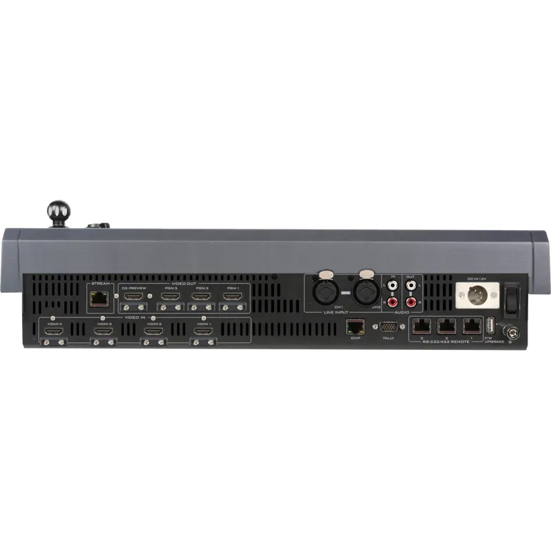 4K HDMI connections for inputs and outputs for connecting to a 4K projector or an IMAG screen. RJ45 connections for controlling up to 3 PTZ cameras via serial protocol.