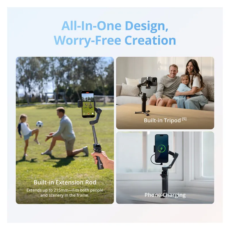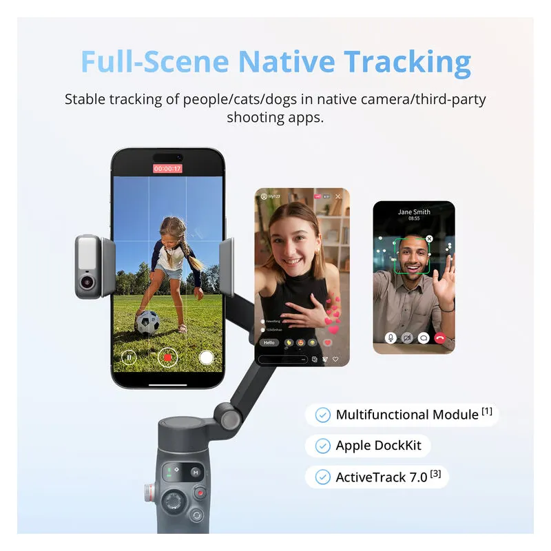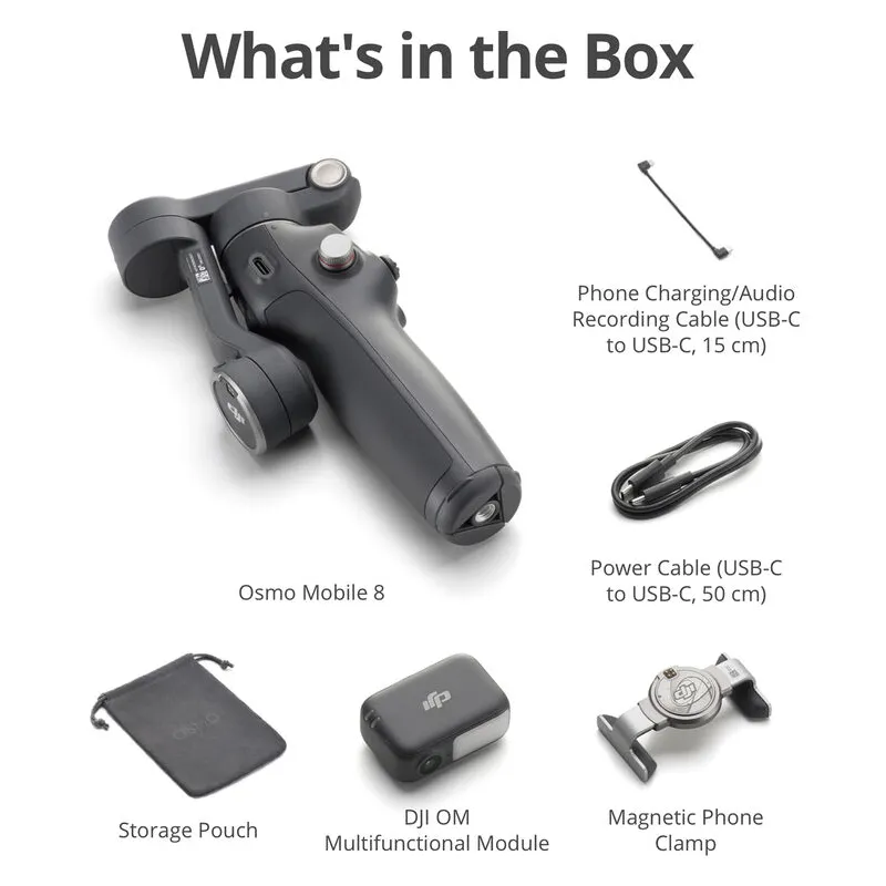 Precīzi sekojiet objektiem, saglabājot stabilu viedtālruņa video, izmantojot DJI Osmo Mobile 8 viedtālruņa gimbal. Atjaunotais gimbal stabilizators piedāvā Multifunkcionālo moduļi un ActiveTrack 7.0 tehnoloģiju. Tas ietver magnētisko tālruņa skavu, kas atbalsta viedtālruņus līdz 3.3" platumam ātrai montāžas saskarnei, iebūvētu pagarinājuma roku un statīvu, kā arī OM Multifunkcionālo moduļi, lai uzlabotu mājdzīvnieku un cilvēku izsekošanas tehnoloģiju, žestu kontroli un apgaismojumu. Citas atjauninājumi ietver tiešu viedtālruņa savienojumu ar Apple DockKit atbalstu, USB-C izeju kameras uzlādei un pretsvēruma montāžas caurumu papildu pretsvēruma pievienošanai.