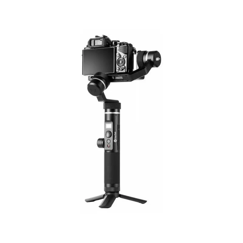 The G6 Plus is a compact and lightweight gimbal designed for cameras weighing up to 1.75 lb and measuring under 2.75" in height. It offers freedom of movement for compact cameras like the Sony a6500. It also supports Feiyu's extension poles for more control.