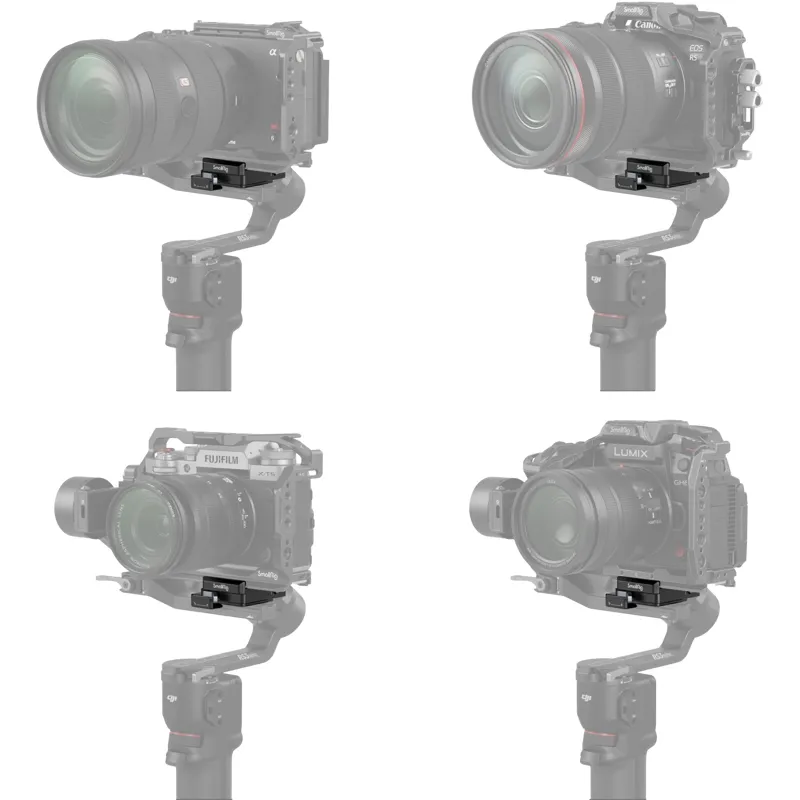 SmallRig Arca-Swiss Mount Plate for DJI RS 3 Mini 4195 is designed to support various other cameras, such as Sony FX3 with 24-70mm lens, Canon R5 with 24-70mm lens, FUJIFILM X-T5 with 16-55mm lens and LUMIX GH6 with 12-60mm lens. They can be mounted by sliding in from the side or top. The rig also helps quickly switch between vertical and horizontal shooting.