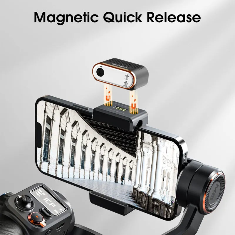 Hohem Magnetic Fill Light, integrēta ar AI Tracking Module for iSteady M6, piedāvā magnētisko fill gaismu un AI redzes sensoru seju un objektu izsekošanai dienā vai naktī.