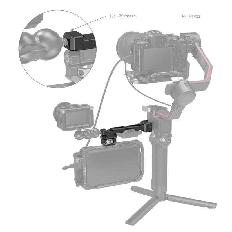 Monitora stiprinājuma augšpusē ir divi 1/4"–20 collu vītņoti caurumi, un tā sānos ir viens 1/4 collu vītņots caurums, ko var piestiprināt ar SmallRig Magic Arm 2163. darbības kamerai vai citām ierīcēm.
