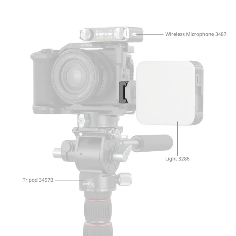 The kit includes detachable positioning pins aligned with the 1/4 20 threaded interface with a positioning hole, making it compatible with most SmallRig cages. When not in use, the positioning pin can be stored on the side of the cold shoe to prevent loss. An arrow on the cold shoe guides users in the accessories mounting direction. The cold shoe mount has a unidirectional sliding design to prevent accidental slipping.