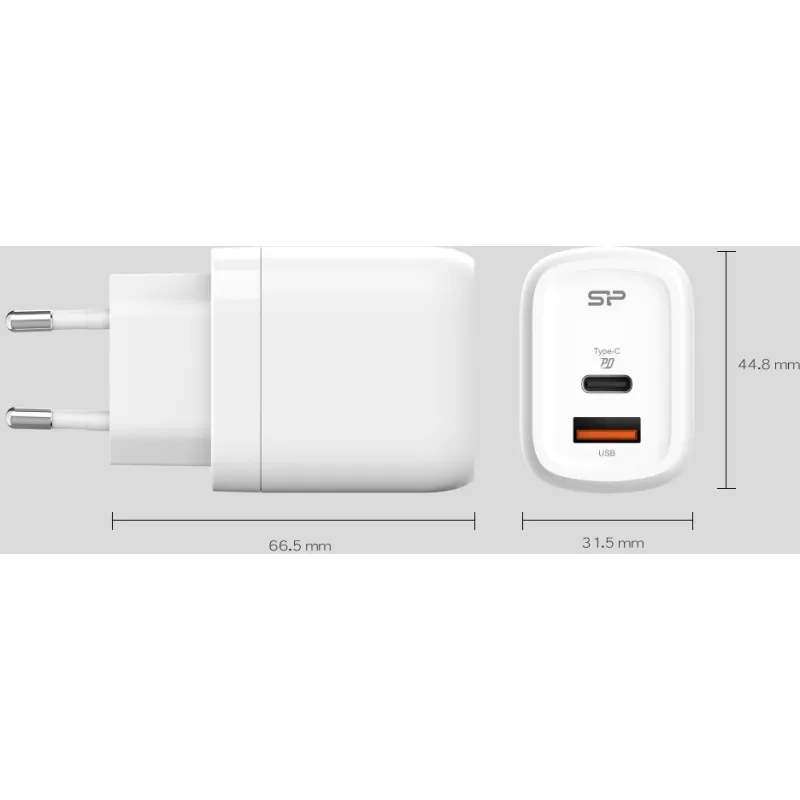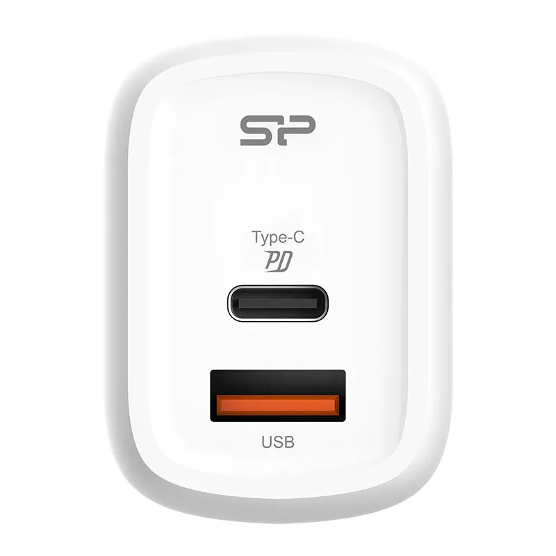 Dual output wall charger with separate USB-C PowerDelivery and USB-A QC3.0 fast charging ports. Silicon Power compact and portable wall adapter ideal for home, office, or on the go to keep all your devices powered.