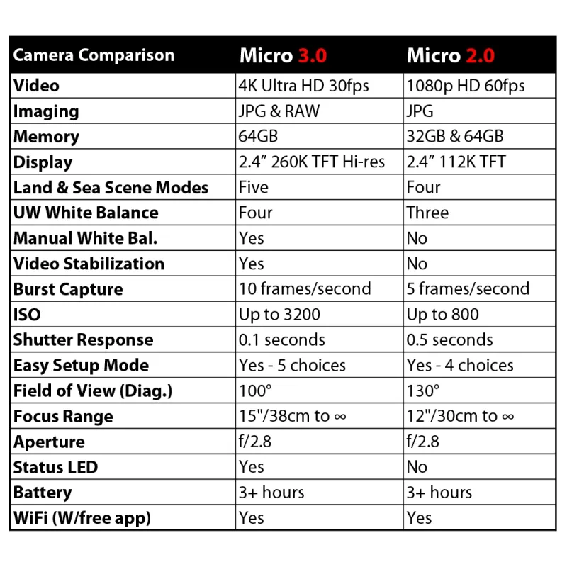 The Micro 3.0 has 64GB of internal storage. Image and videos can be transferred to Android or IOS devices via the SeaLife Micro 3.0 App or by USB cable. The SeaLife Micro 3.0 is available as a camera only model, or as a complete set, including either one Sea Dragon 3000F Auto or two Sea Dragon 2500F underwater LED lights.