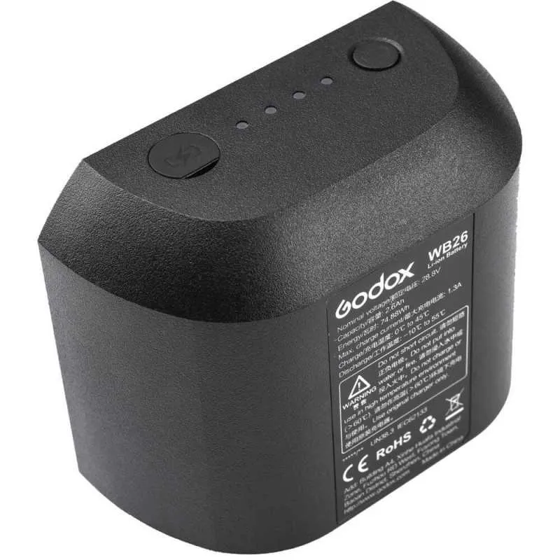 The Godox WB26 battery is a lithium ion battery for the Godox AD600 Pro series flash units. The battery has a capacity of 2600mAh, which is enough to flash at full power approximately 350 times. The Godox WB26 can be used as a replacement battery, but also very handy as an extra battery if you are not satisfied with the 360 flashes of a single battery charge. ,