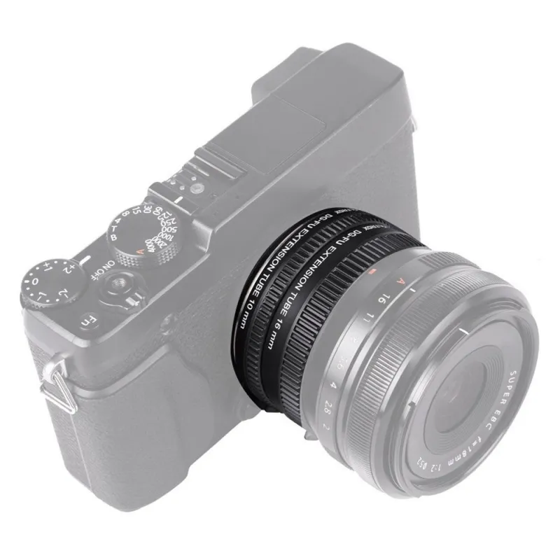 Auto Focus extension tube, designed for Fujifilm Macro lens to shoot at closer distance with higher magnification. Combined with 2 tubes in different length: 10mm & 16mm, can be used in any combination or individually to obtain the different magnification.