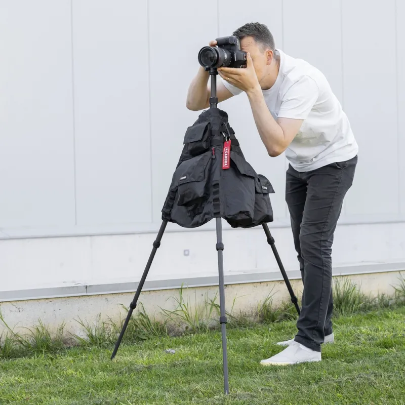 The tripod jacket is provided with two carabiner hooks, where you can hang various things. Mount the weatherproof jacket easily on different tripods. Prevent the tripod from opening in transport thanks to the closable mesh.