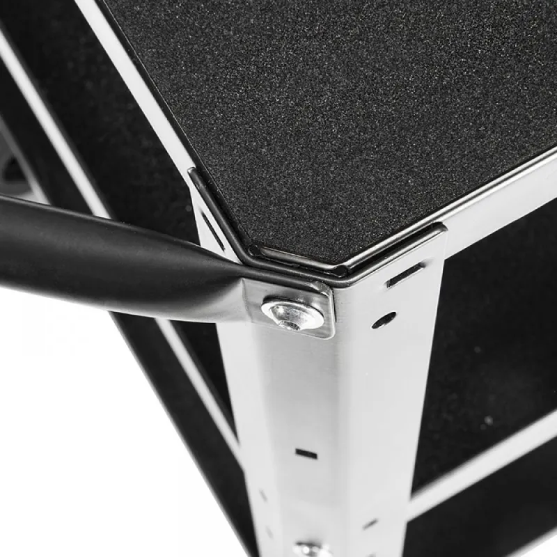The upper shelf of the cart has been designed in order to have a double function. In fact, it can be used as a workstation or, by overturning the shelf, it can carry any equipment.