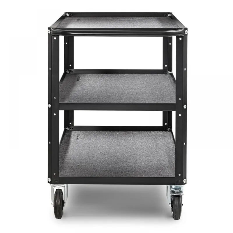 Three-shelf cart completely in black steel (RAL 9005). Large version.