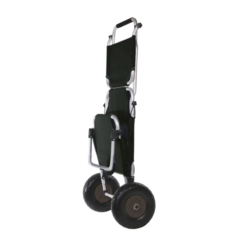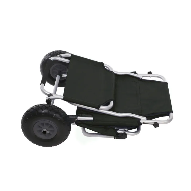 The trolley won't sink on a soft underground and can be used in odd areas thanks to the wide, sturdy tyres. There is a box on the back for accessories. The Pro Trolley I is provided with a folding sunroof and a folding luggage rack extension.