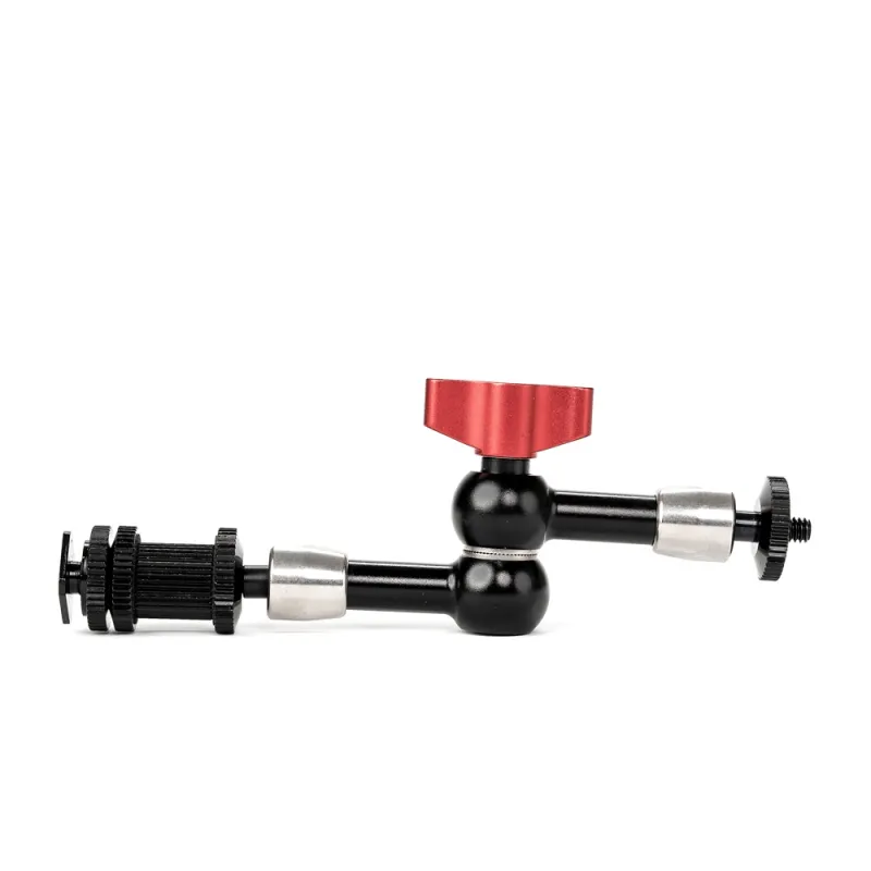 The Caruba Magic Arm 7" - Wing Knob with cold shoe adapter offers a solid support for mounting a monitor, light or other accessory to your camera rig. The arm has a maximum carry weight of 3 kilogram and a big red handle that provides a solid, single point lock for the three hinge points.