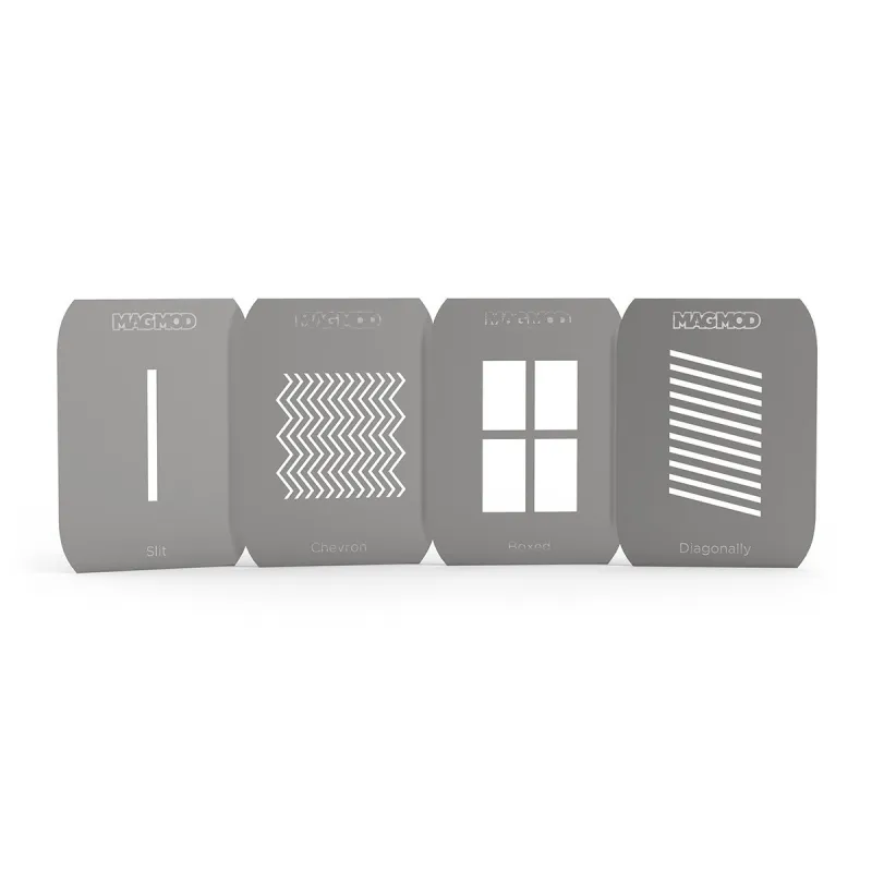 The MagMod MagMask Standard Set is a set of four stainless Steel gobos designed for use with the Magmod MagBeam Fresnel Lens to project patterns of light onto your background or subject. The MagMask Standard kit is comprised of four gobos with four different patterns.